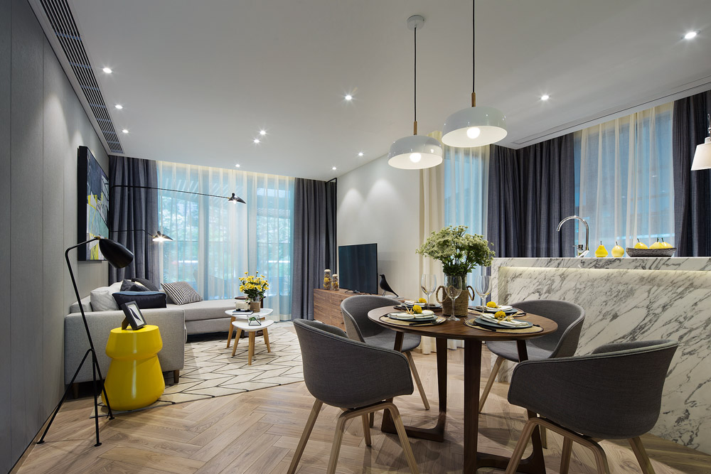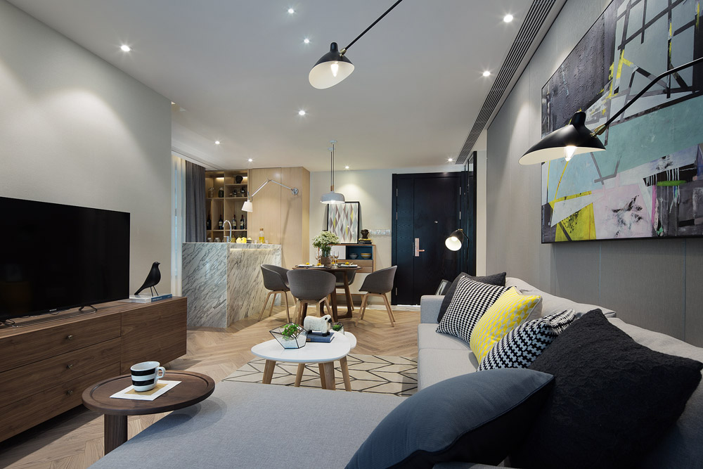 设计采用黑白灰为空间的主色调,创意性的把一个LOFT风格做得酷意十足。虽然这种颜色处理手法,可以有效的提高空间的纵深感,但由于处理不好就容易给人冰冷的感觉,所以一般不敢轻易采用。而在这套样板间中,在大基调的冷色之外,又在局部采用了比较跳跃的色彩,加上搭配了一些暖色的家具和装饰品,让空间平添了不少温馨感觉。另外,设计还采用了多种材质和造型的装饰材料,来形成整体的装饰效果和空间氛围,使整个样板间虽然统一在“黑白印象”之下,但整体感觉非常丰富和富于变化。