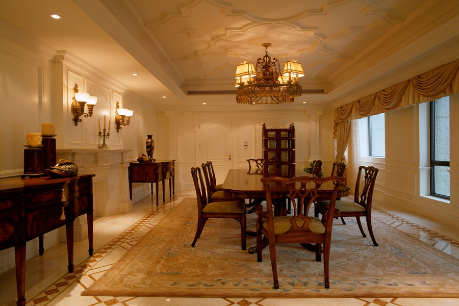 设计说明:居宅样茂呈现业主的尊贵品味,根据本案的空间优势,以独特的视角展演场域的内涵层次,并注入极具奢华的欧式语汇,满足层峰人士所希冀的设计蓝图。推开门扉,一层及负一层的客餐厅以完全开阔的格局呈现,充分感受开放连贯的宽敞气度。